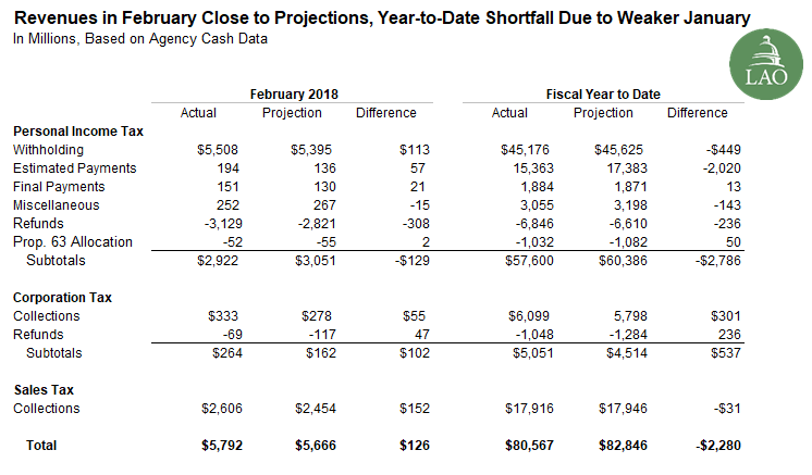 February Revenues Roughly on Track. Overall, February collections for the state’s three largest sources of revenue—the personal income tax (PIT), sales tax, and corporation tax—were $117 million ahead of the administration’s January projections. As seen in the figure below, the modest PIT shortfall was due to higher than expected refunds. The higher sales tax collections likely reflect the timing issue associated with the new IT system and make up for the January sales tax shortfall.