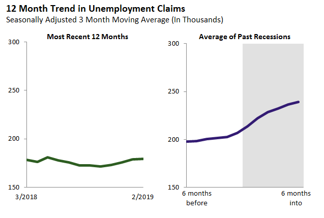 Claims ended 2018 on a slight upward trend, increasing from 169,000 (after seasonal adjustment) in October to 176,000 in November and 184,000 in December. Claims have departed from this trend in the first two months of 2019, moving sideways instead of up. That being said, claims were still about 4 percent higher in February than six months prior. As the graph below shows, unemployment claims typically rise over the six months leading into a recession. The slight uptick over the most recent six months, however, is more modest than the typical increase leading into a recession. On average, claims increase 8 percent over the six months leading into a recession.
