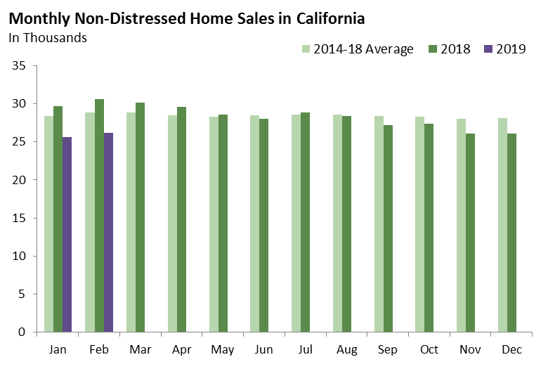 Home sales can be a good indicator of the health of the state’s economy and housing markets. Home sales have been slowing since the summer of 2018. There were an estimated 26,100 non-distressed (not resulting from mortgage delinquency or foreclosure) home sales statewide in February. This compares to 30,500 in February 2018. (This data is “seasonally-adjusted” because some months are predictably higher or lower than others.)