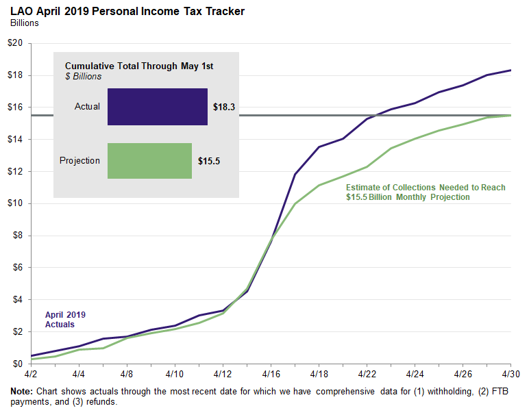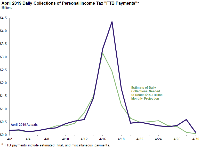 The green line represents an estimate of daily collections necessary to meet the administration’s $14.2 billion projection for the month (based on the historical pattern of payments). The purple line shows actual collections through the month. As seen in the figure, collections on the days right after tax day were significantly above the projection. Actual FTB payments for April were over $16.8 billion.