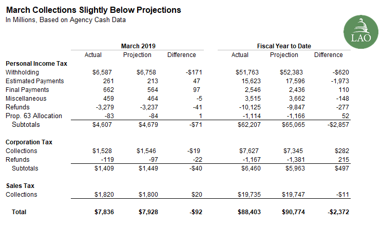 Preliminary March Collections Slightly Below Projections. Preliminary March collections from the personal income tax (PIT), corporation tax, and sales tax were $92 million below the administration’s January estimates. The largest component of the shortfall was lower than expected PIT withholding. This seemingly low withholding collection should not be cause for concern, however, as withholding was nearly 9 percent higher than the comparable days in 2018. (The shortfall likely reflects a difference in the number of collection days in March 2019 compared to March 2018.)