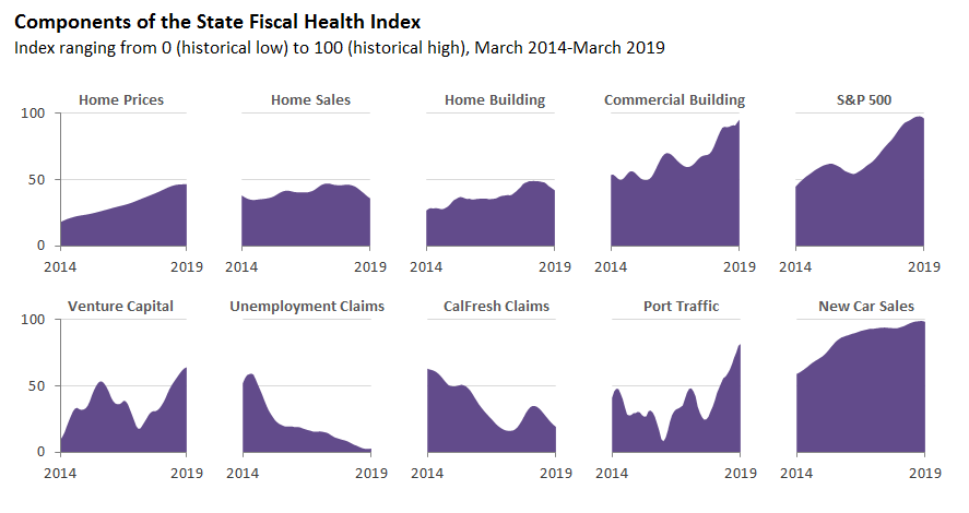 The index combines ten key data points: home prices, home sales, residential and commercial building permits, the S&P 500 stock market index, venture capital funding, unemployment insurance claims, CalFresh claims, port traffic, and new car sales. With the exception of the S&P 500, all of this data is specific to California. An increase in these economics variables signals a more positive revenue situation, while a decline suggests a worsening revenue outlook. There are two exceptions to this pattern: claims for unemployment insurance and CalFresh. When claims for unemployment insurance and CalFresh decline this signals an improving revenue situation, while rising claims signal a worsening situation. The graph below shows the recent trends in these variables.