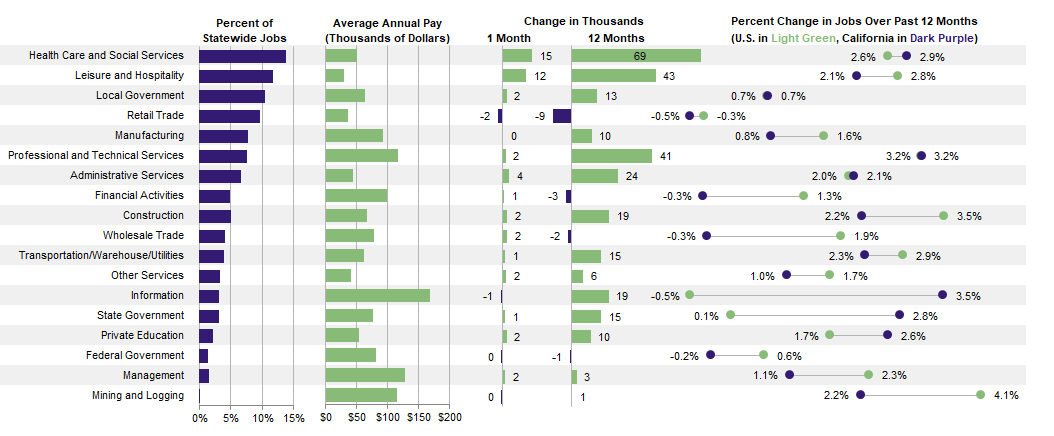 California's Employment Development Department and the U.S. Bureau of Labor Statistics released California's April 2019 state jobs report today. Statewide nonfarm employment grew by an estimated 46,000 in April, well above the average pace of the past 12 months. So far, job growth has been faster in 2019 than in 2018. The official unemployment rate remained at 4.3 percent, which is still quite low by historical standards.