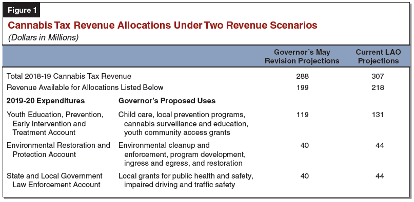 Current LAO Revenue Projections. Based on the latest revenue data, our best estimate of 2018-19 cannabis tax revenue is $307 million—$19 million above the administration’s May Revision estimate.