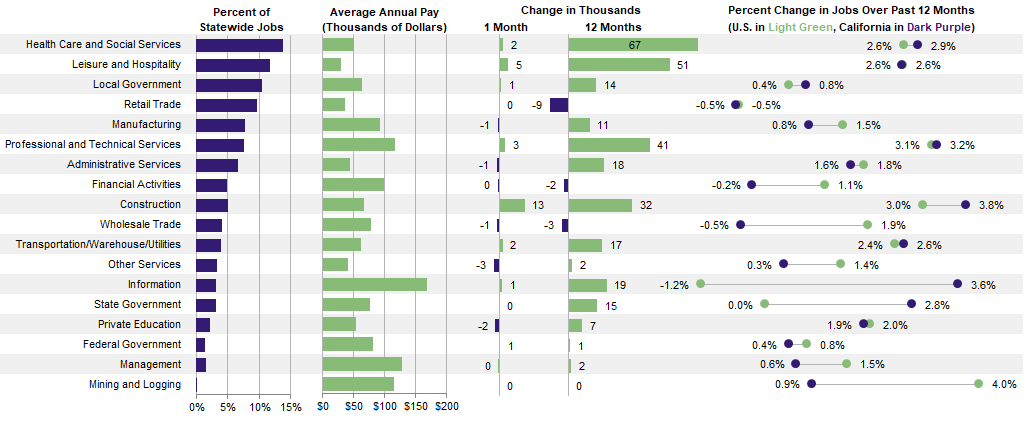 The figure below summarizes nonfarm employment by sector based on the monthly survey of employers. Information has been the slowest growing sector nationwide, yet the second fastest growing sector in California. This difference may be due to the fast-growing software, data processing, and web search subsectors accounting for 48 percent of information sector jobs in California but just 24 percent nationwide. Overall employment in both the state and the nation have grown 1.6 percent over the previous 12 months.