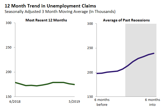 Unemployment claims are a useful indicator of the health of the state’s economy. As the figure below shows, unemployment claims have been near historic lows for over a year. May 2019 claims continued to be low by historic standards, totaling 173,000. (We apply a “seasonal adjustment” to the claims data because some months are predictably higher or lower than others.)