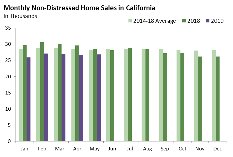 Home sales can be a good indicator of the health of the state’s economy and housing markets. Home sales have been relatively weak in recent months. There were an estimated 26,800 non-distressed (not resulting from mortgage delinquency or foreclosure) home sales statewide in May. This below the 28,500 sales in May 2018 and the long-term historical average of 31,400 sales per month. (This data is “seasonally-adjusted” because some months are predictably higher or lower than others.)