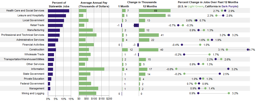 The figure below summarizes nonfarm employment by sector based on the monthly survey of employers. Construction has long been one of the most volatile and cyclical sectors, and it has been the fastest growing sector over the past year. The well-paying professional/technical services and information sectors and the large health and leisure-hospitality sectors have also enjoyed high growth during that period. Overall employment in the state has grown 1.7 percent over the previous 12 months, slightly ahead of the national pace of 1.5 percent.