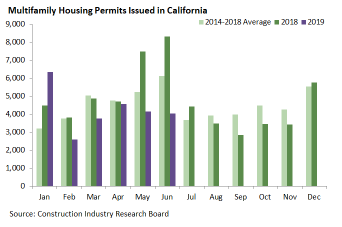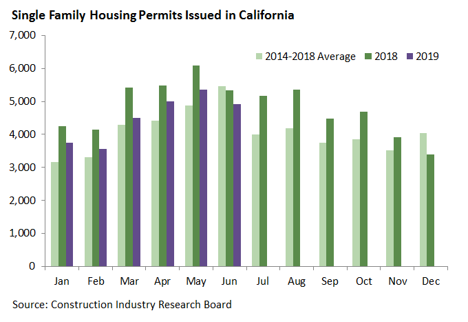 Multifamily housing units (25,500) have made up about half of the permits issued in 2019. Multifamily permits have been notably weak in recent months, falling below prior year by 44 percent in May and 51 percent in June. Overall, multifamily permitting is down 24 percent through the first half of 2019 as compared to 2018.