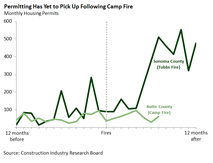 Last summer, we noted that there was significant uptick in housing permits in Sonoma County during the months following the Tubbs Fire, suggesting the rebuilding process started relatively quickly. In contrast, rebuilding has not occurred as quickly in Butte County following the Camp Fire last fall. Whereas housing permits in Sonoma County more than doubled in the six months following the Tubbs Fire, permits in Butte County have been relatively flat thus far in 2019.