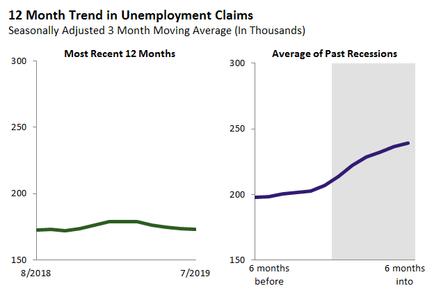 Unemployment claims are a useful indicator of the health of the state’s economy. As the figure below shows, unemployment claims have been near historic lows for over a year. July 2019 claims continued to be low by historic standards, totaling 168,000. (We apply a “seasonal adjustment” to the claims data because some months are predictably higher or lower than others.)
