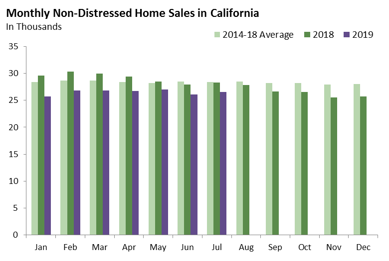 Home sales can be a good indicator of the health of the state’s economy and housing markets. Home sales have been relatively weak in recent months. This remained true in July, despite a modest uptick in sales relative to June. In July, there were an estimated 26,600 non-distressed (not resulting from mortgage delinquency or foreclosure) home sales statewide. This is below the 28,300 sales in July 2018 and the long-term historical average of 31,500 sales per month. (This data is “seasonally-adjusted” because some months are predictably higher or lower than others.)