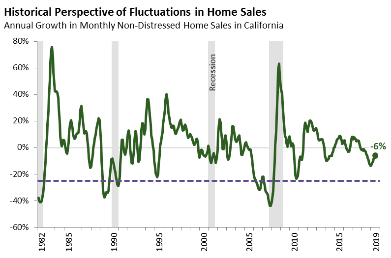 Home sales were on a clear downward trend during the second half of 2018 and the beginning of 2019. Sales seem to have stabilized in recent months and are no longer declining from month to month. Nonetheless, sales remain at relatively weak, but not as weak as is typically seen before economic downturns.