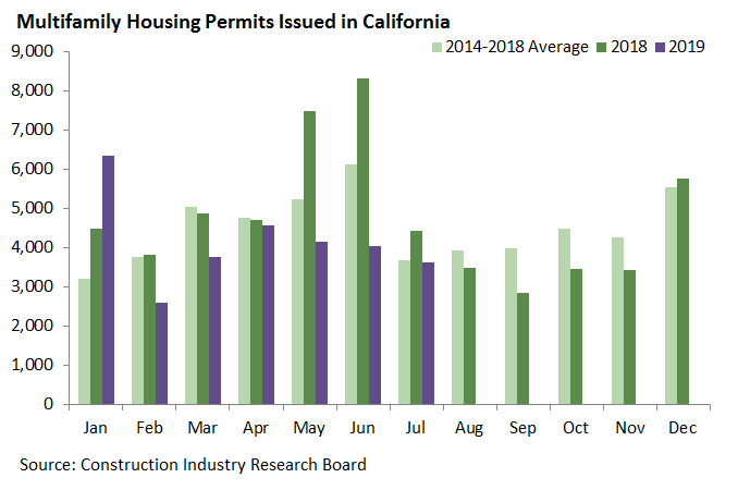 Multifamily housing units (29,100) have made up about half of the permits issued in 2019. Following two very weak months in May and June, multifamily permits posted declines again in July, although not quite as severe. Overall, multifamily permitting is down 23 percent through the first seven months of 2019 as compared to 2018.
