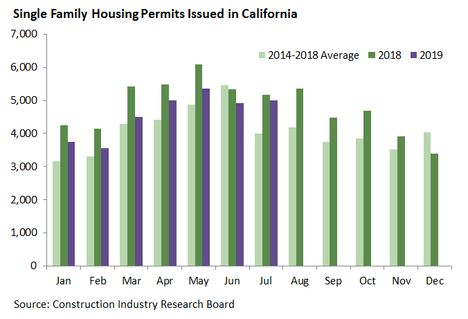 Single family housing permits (32,100) have made up the other half of permits issued in 2019. Single family permits declined 3 percent in July relative to a year ago. Through the first seven months of 2019, single family permits are down 10 percent compared to 2018.
