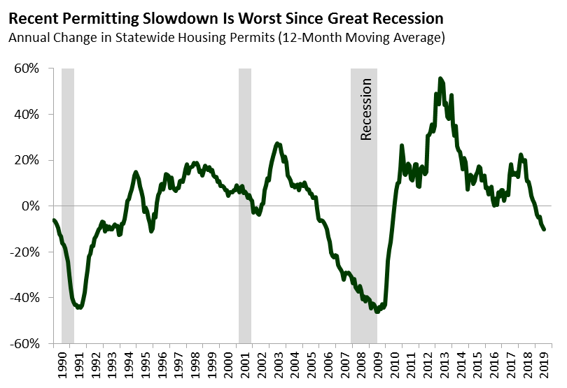 The recent slowdown in housing permits is the most severe since the Great Recession. Since 1990, only two other times periods—the first half of 1990s and the Great Recession—have had permitting declines as significant as the state has experienced over the past year.