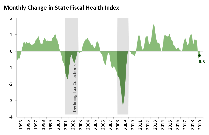 We created the State Fiscal Health Index to track the strength of economic conditions relevant to the state’s fiscal health. The index ranges from 0 (representing the lowest level in the last 25 years) to 100 (representing the highest level in the last 25 years). Both the level of the index and changes in the index from month to month offer information about the state’s fiscal health. When the index is high, revenues tend to be high compared to historical norms. Similarly, when the index is increasing, state revenues are likely to increase over the next six to twelve months. On the flipside, a consistent decline in the index over a few months has typically signaled that the state is entering an extended period of revenue weakness.