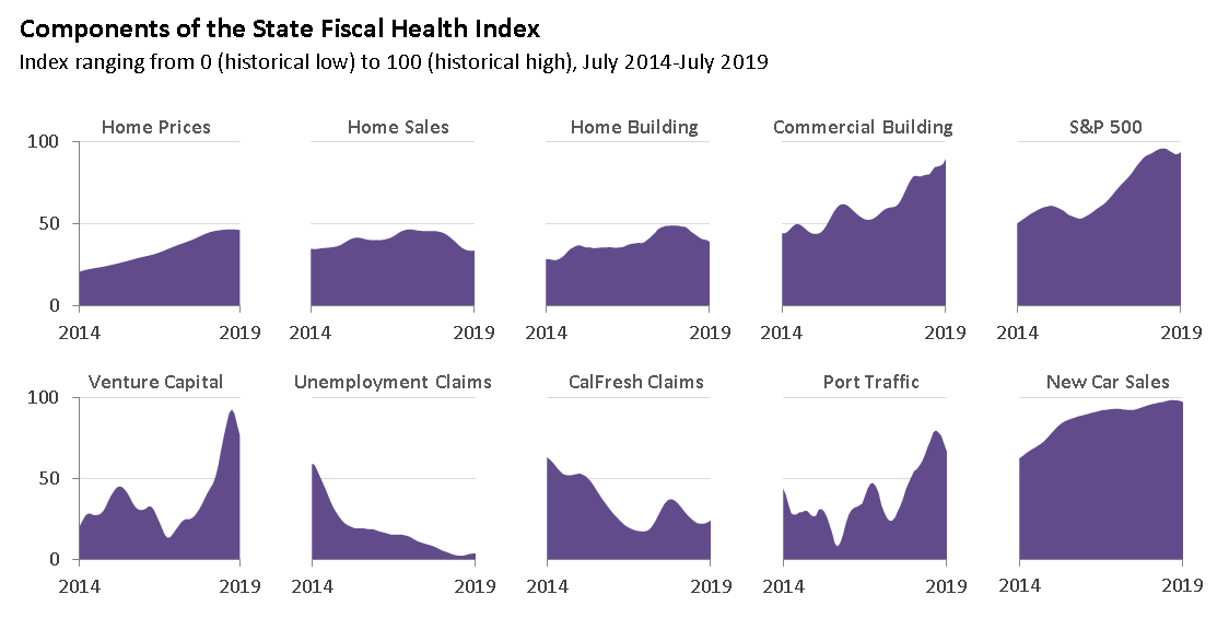 The index combines ten key data points: home prices, home sales, residential and commercial building permits, the S&P 500 stock market index, venture capital funding, unemployment insurance claims, CalFresh claims, port traffic, and new car sales. With the exception of the S&P 500, all of this data is specific to California. An increase in these economics variables signals a more positive revenue situation, while a decline suggests a worsening revenue outlook. There are two exceptions to this pattern: claims for unemployment insurance and CalFresh. When claims for unemployment insurance and CalFresh decline this signals an improving revenue situation, while rising claims signal a worsening situation. The graph below shows the recent trends in these variables.