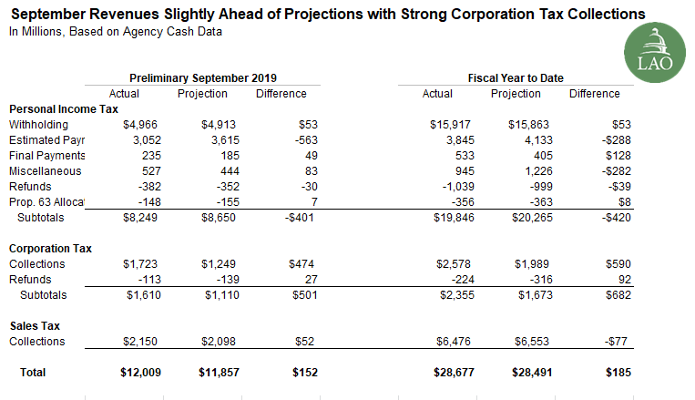 Personal Income Tax (PIT) Revenue Lower than Expected. As seen in the figure below, September PIT revenue fell short of expectations by $401 million. The largest shortfall was in estimated payments, which were15.6 percent below projections. So far this year, estimated payments attributable to tax year 2019 (February through September) are running 0.7 percent below the same period in 2018 despite generally higher stock prices and continued economic growth. The September decline may be in part due to a general weakening of expectations for the rest of the year despite generally higher stock prices and continued economic growth: federal estimated and final payments fell 3.7 percent last month compared to September 2018. Moreover, at the state level, while September typically accounts for about 10 percent of total quarterly estimated payments, state law does not require filers to make payments in September.