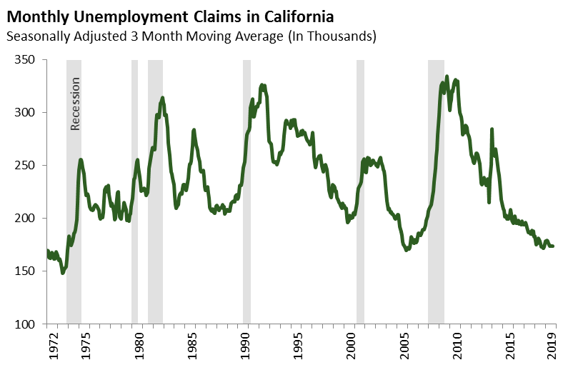 Unemployment claims are a useful indicator of the health of the state’s economy. As the figure below shows, unemployment claims have been near historic lows for over a year. September 2019 claims continued to be low by historic standards, totaling 179,000. (We apply a “seasonal adjustment” to the claims data because some months are predictably higher or lower than others.)