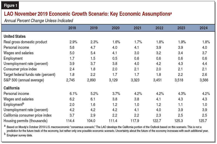 Below are summaries of the key economic assumptions underpinning the economic growth scenario through 2024 in our November 2019 Fiscal Outlook. (The outlook also discusses how state revenues would perform in a hypothetical recession scenario.)