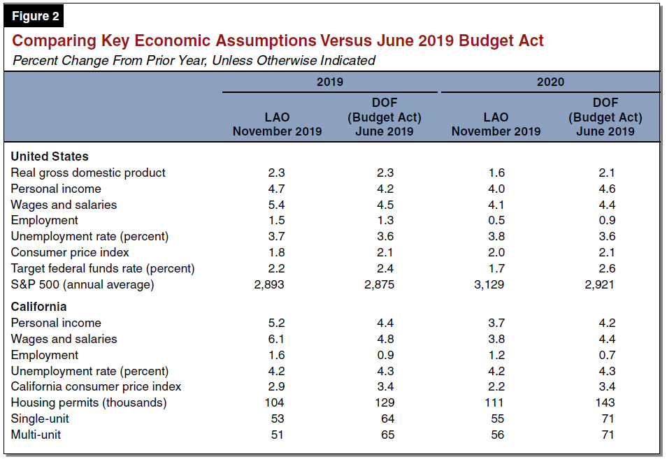 The figure below compares our November 2019 near-term economic assumptions to those reflected in the June 2019 state budget package. (The June budget assumptions were based on the Department of Finance's May 2019 economic forecast.)