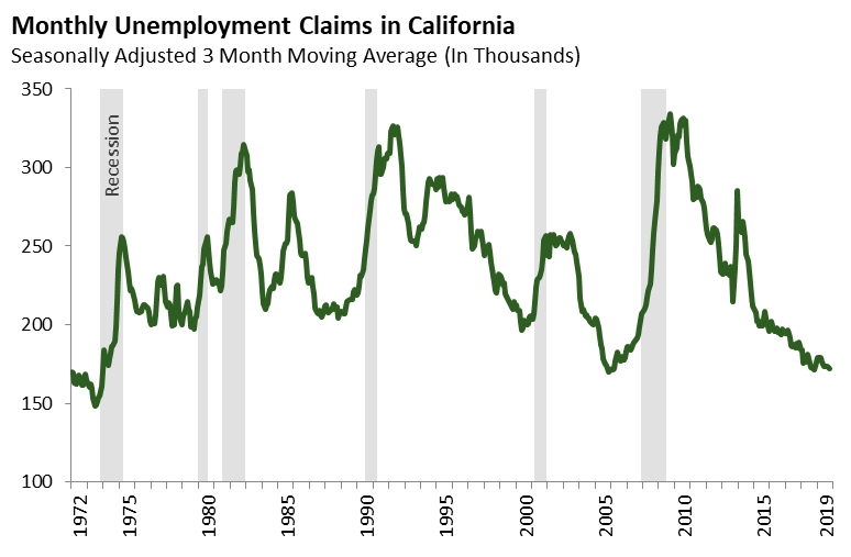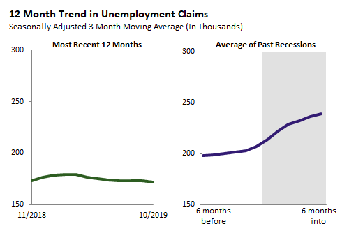 Unemployment claims are a useful indicator of the health of the state’s economy. As the figure below shows, unemployment claims have been near historic lows for over a year. October 2019 claims continued to be low by historic standards, totaling 164,000. (We apply a “seasonal adjustment” to the claims data because some months are predictably higher or lower than others.)