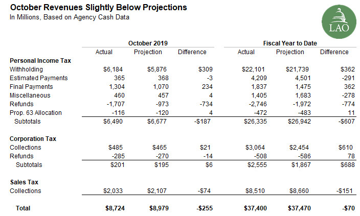 Overall, October revenue collections from the state’s three largest taxes—the personal income tax (PIT), corporation tax, and sales tax—fell $255 million below projections in October. Year-to-date, revenues are $70 million below projections. While PIT collections have been somewhat lower than expected this year, corporation tax collections remain almost $700 million ahead of June estimates due to strong collections the first three months of the year. The October PIT shortfall primarily was due to higher refund claims from mostly upper-income filers who filed for extensions in April.