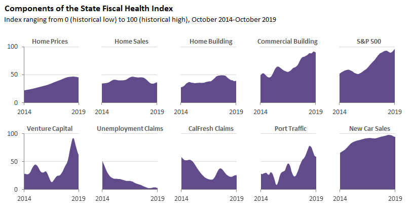 The index combines ten key data points: home prices, home sales, residential and commercial building permits, the S&P 500 stock market index, venture capital funding, unemployment insurance claims, CalFresh claims, port traffic, and new car sales. With the exception of the S&P 500, all of this data is specific to California. An increase in these economics variables signals a more positive revenue situation, while a decline suggests a worsening revenue outlook. There are two exceptions to this pattern: claims for unemployment insurance and CalFresh. When claims for unemployment insurance and CalFresh decline this signals an improving revenue situation, while rising claims signal a worsening situation. The graph below shows the recent trends in these variables.