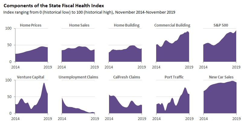 The index combines ten key data points: home prices, home sales, residential and commercial building permits, the S&P 500 stock market index, venture capital funding, unemployment insurance claims, CalFresh claims, port traffic, and new car sales. With the exception of the S&P 500, all of this data is specific to California. An increase in these economics variables signals a more positive revenue situation, while a decline suggests a worsening revenue outlook. There are two exceptions to this pattern: claims for unemployment insurance and CalFresh. When claims for unemployment insurance and CalFresh decline this signals an improving revenue situation, while rising claims signal a worsening situation. The graph below shows the recent trends in these variables.