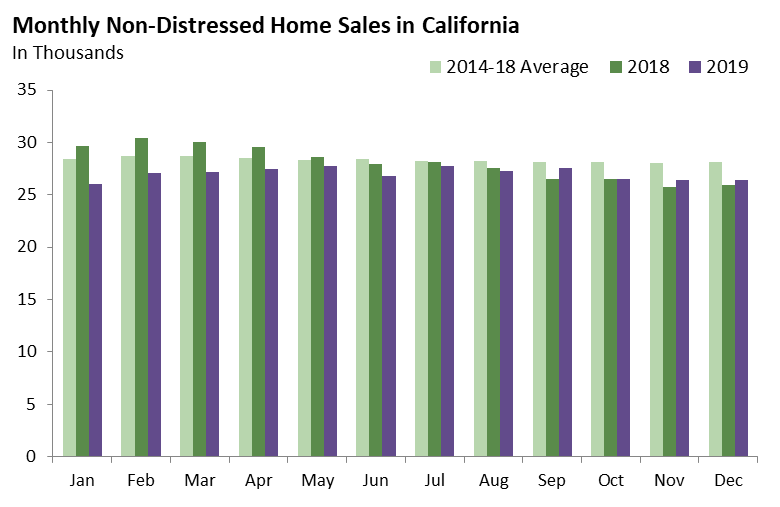 Home sales can be a good indicator of the health of the state’s economy and housing markets. Home sales have been sluggish since the summer of 2018, and this trend continued in December with an estimate of 26,500 non-distressed (not resulting from mortgage delinquency or foreclosure) statewide home sales. The November estimate was revised upward from 25,700 to 26,400, which combined with the similar December total should ease concerns about the market continuing to weaken. Still, the slow pace of late 2018 and all of 2019 is consistent with recent evidence that the state’s population growth has slowed. (This data is “seasonally adjusted” because some months are predictably higher or lower than others.)