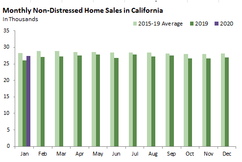 Home sales can be a good indicator of the health of the state’s economy and housing markets. Home sales have been somewhat sluggish since the summer of 2018, and this trend appeared to continue in January with a preliminary estimate of 27,400 non-distressed (not resulting from mortgage delinquency or foreclosure) statewide home sales. This estimate is subject to revision, which will likely be upward if recent trends hold: The initial November estimate has been revised upward from 25,700 to 26,600, and December from 26,500 to 26,900. In any case, home sales activity is significantly weaker now than it was from late 2016 to early 2018, when the monthly total was regularly near or above 30,000.