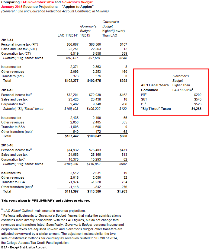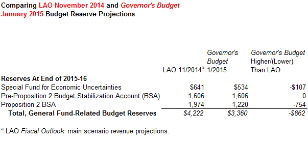 The administration's 2013-14 through 2015-16 "Big Three" tax revenue projections are $1.3 billion above those in the LAO November 2014 Fiscal Outlook, after adjusting for some technical differences to make the two projections comparable on an "apples to apples" basis. The Governor proposes that the state maintain $3.4 billion of total budget reserves at the end of 2015-16, or about $860 million less than projected in the LAO November 2014 Fiscal Outlook. These figures are based on a preliminary review of administration documents accompanying the 2015-16 Governor's Budget proposal, and the numbers, therefore, are subject to revision later.
