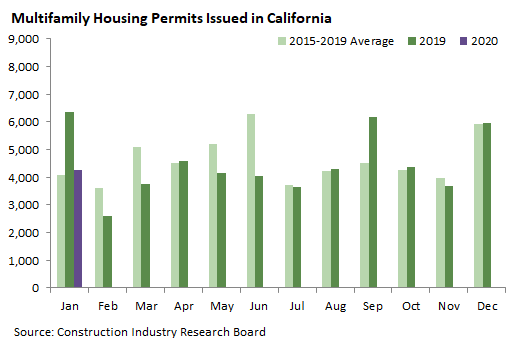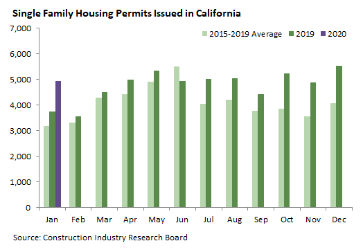 California recorded 9,197 housing permits in January, the second highest January total since 2007, although down 9 percent from January 2019 which was an unusually strong month.