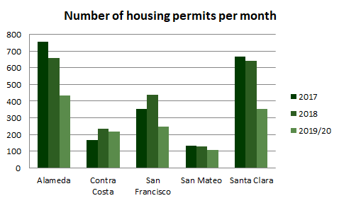Housing permit activity in the San Francisco Bay Area has slowed since the beginning of 2019, as the graph below shows for the area’s five largest counties. This slowdown has been especially apparent in Santa Clara county, although Alameda and San Francisco counties have also seen significant drops. In each of these counties, the decline was entirely due to fewer multifamily permits. Contra Costa and San Mateo counties have not seen similar declines, although they still lag far behind the other counties in overall permit activity.