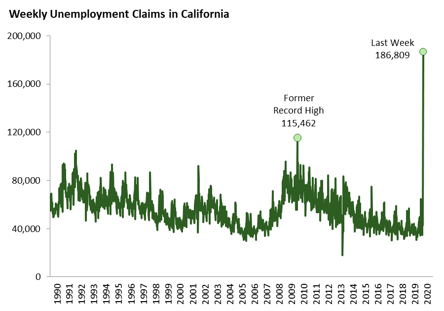 Historically High Claims. California had 186,809 initial claims during this period. This is the highest number of claims on record, eclipsing the former high of 115,462 in January 2010. This number of claims also is a significant increase from the prior week (57,606) and the weekly average for 2020 (46,000).