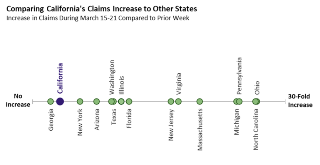 Other States Saw Even Larger Increases Than California. While California had a record-setting increase in claims last week, many other states experienced much larger increases in claims. Among the 15 largest states, claims were, on average, 11 times higher (128,000 compared to 12,000) during the week of March 15-21 compared the week prior. California, in contrast, saw only a 3-fold increase in claims.