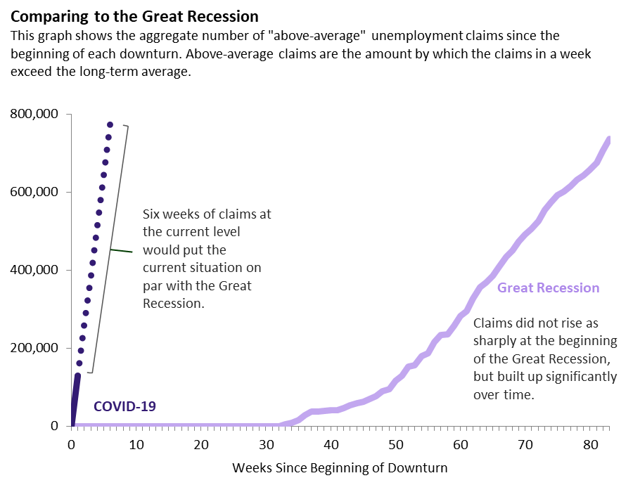 A Long Way To Go to Reach Overall Severity of the Great Recession. The jump in claims last week exceeded even the largest jump seen during any week of the Great Recession. This does not mean, however, that the overall severity of unemployment currently is worse than the Great Recession. The Great Recession was so bad, in large part, because of its extended duration. Weekly unemployment claims remained elevated for the better part of two years. Over time, this led to an historically large number of workers on unemployment insurance. For the current downturn to match the overall severity of the Great Recession, claims would need to remain at the current elevated level for at least several weeks.