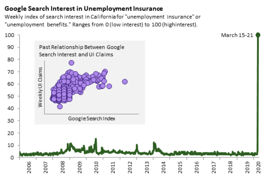 Claims Data Released Next Week Likely to Remain Elevated. Some evidence suggests that claims during the current week (March 22 to March 28) will remain at very high levels. For example, Google search interest in unemployment insurance among Californians spiked to unprecedented levels last week and has remained elevated thus far during the current week. (We measure Google search interest based on Google Trends data on searches for “unemployment insurance” and “unemployment benefits.”) Historically, there has been a relatively strong relationship between Google searches for unemployment insurance during a week and unemployment claims in that same week. While, there is some risk in extrapolating too much from this historical relationship given the extraordinary nature of the current circumstances, we think it is at least suggestive that next week’s claims report will remain elevated.