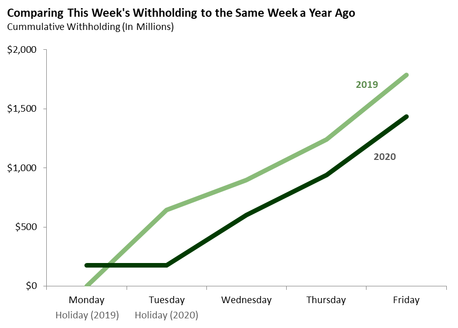 The first graph compares withholding payments received this week to payments received in the comparable week in 2019, which ran from Monday, April 1 to Friday, April 5 of that year. For the second week in a row, withholding shows a significant impact of the COVID-19 outbreak, with payments this week down 20 percent compared to the same week a year ago.