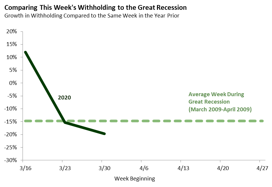 Bottom Line: Withholding has declined significantly during the last two weeks. These declines have been on par with those seen during the same weeks in 2009, the trough of the Great Recession.