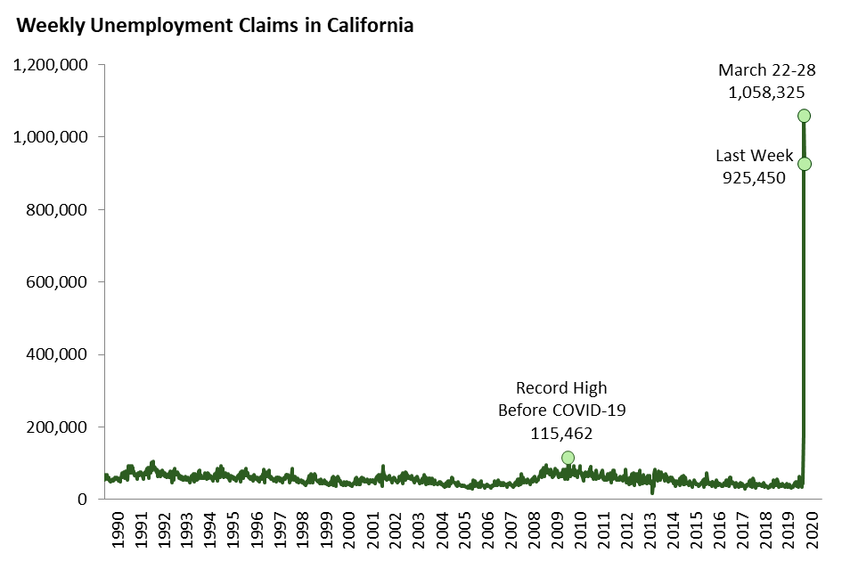 Historically High Claims. California had 925,450 initial claims during this period. Similar to last week, this is far above the record high prior to the COVID-19 outbreak of 115,462 in January 2010. Last week’s claims are slightly below the revised number for the week of March 22 to March 28 (1,058,325).