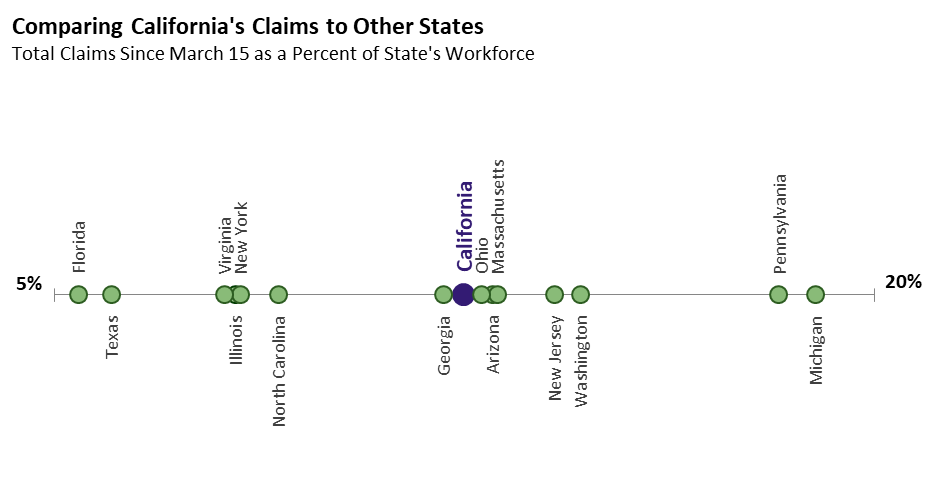 Level of Claims in California in the Middle of the Pack Among Large States. Over the last three weeks California has processed about 2.2 million unemployment claims. These claims represent about 12.5 percent of the state’s workforce. On this metric, California is in the middle of the pack among large states.