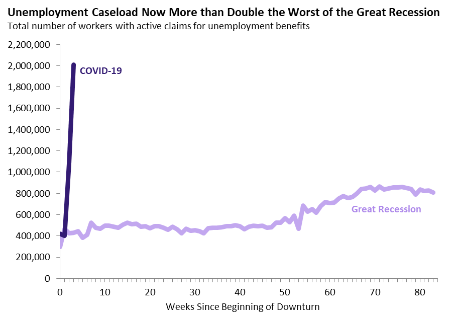 COVID-19 Slowdown Already Deeper Than Great Recession. California now has around 2 million workers with active unemployment claims. This is more than double the peak of active claims during the Great Recession. That being said, a major factor that contributed to the severity of the Great Recession is that so many people were unemployed for such a long period of time. While the current number of unemployed workers exceeds the Great Recession, it remains to be seen how long these workers will remain without work.