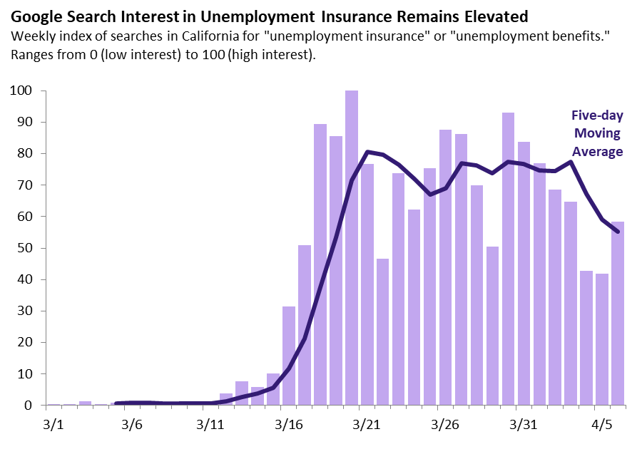 High Level of Claims Will Continue. In a previous post, we pointed out that there is a relatively strong historical relationship between Google search interest in unemployment insurance during a week and the number of unemployment claims in that same week. Search interest spiked to unprecedented levels about three weeks ago and has remained elevated. As a result, we anticipate that claims will remain at very high levels for at least the next few weeks.