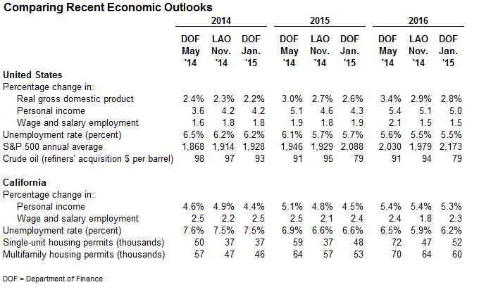 Below, the figure compares the administration's new January 2015 budget proposal economic projections, with those the administration prepared last May (and which were incorporated into the state's 2014-15 budget plan last June), as well as our office's November 2014 economic projections.
