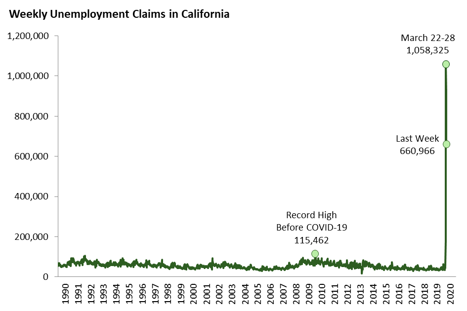 Historically High Claims. California had 660,966 initial claims during this period. Claims have ticked down for two weeks in a row after peaking at about 1 million during the week of March 22 to March 28. Nonetheless, the claims total for April 5 to April 11 is still six times greater than the record high prior to the COVID-19 outbreak of 115,462 in January 2010.