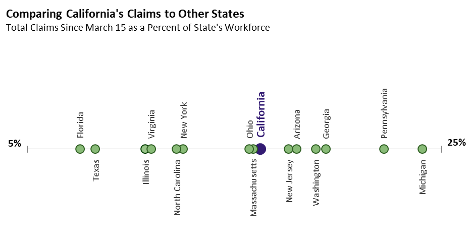 Level of Claims in California in the Middle of the Pack Among Large States. Over the last three weeks California has processed about 2.8 million unemployment claims. These claims represent about 16 percent of the state’s workforce. On this metric, California is in the middle of the pack among large states.
