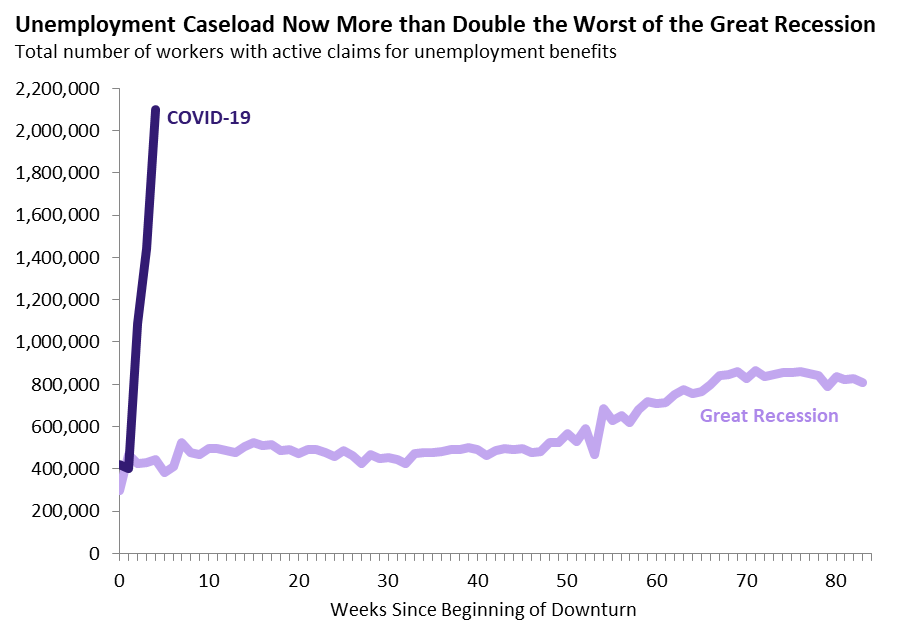 COVID-19 Downturn Already Deeper Than Great Recession. California now has around 2 million workers with active unemployment claims. This is more than double the peak of active claims during the Great Recession. That being said, a major factor that contributed to the severity of the Great Recession is that so many people were unemployed for such a long period of time. While the current number of unemployed workers exceeds the Great Recession, it remains to be seen how long these workers will remain without work.