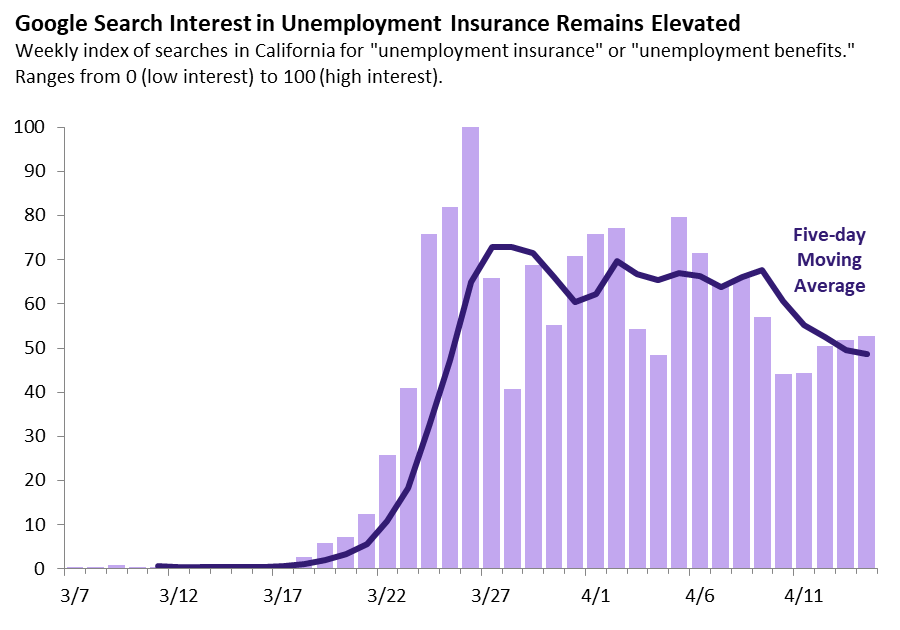High Level of Claims Will Continue. In a previous post, we pointed out that there is a relatively strong historical relationship between Google search interest in unemployment insurance during a week and the number of unemployment claims in that same week. Search interest spiked to unprecedented levels about a month ago. Over the last two weeks, search interest has decline modestly, but still remains significantly higher than at any other time in the last fifteen years, including during the worst of the Great Recession. As a result, we anticipate that claims will continue to be in the hundreds of thousands per week for at least the next few weeks.